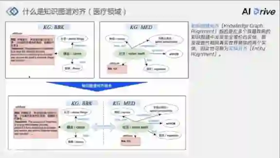 如果去校验某一节点,人工成本非常高,相比小规模的垂域突破,比如关于药物或者药物间相互作用的图谱,它们的规模更小,可以在控制成本的基础上把握知识的准确率或者知识图谱的质量,因此,可以通过图谱对齐技术将规模比较小、相对质量比较高的图谱进行融合,构建一个大规模高质量的医疗知识图谱。