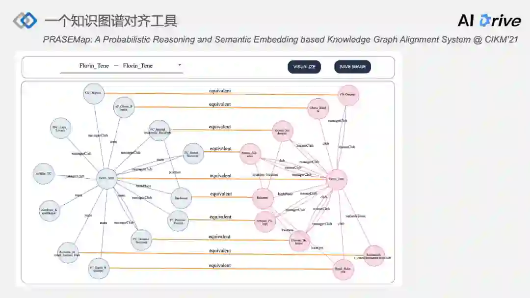 上图是关于对齐之后的知识图谱的展示效果,在知识图谱对齐中,当中心实体是对齐的,其邻居很多也是对齐的,如果知识图谱的构建不容易,这样的例子也可以完全展示出这样的效果,或者开发这样前端的框架,是为了方便大家更直观地理解知识图谱对齐之后的可解释或者深层次的关系,通过这种邻居关系信息的传导,构建起跨图谱的对齐关系。