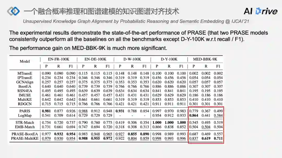 第三,尝试将传统的概率推理系统和基于图谱建模的系统的深度学习方法进行结合,提出了统一的框架 PRASE,充分发挥了两者的优势,从而取得比两个方向都要更好的知识图谱对齐性能。