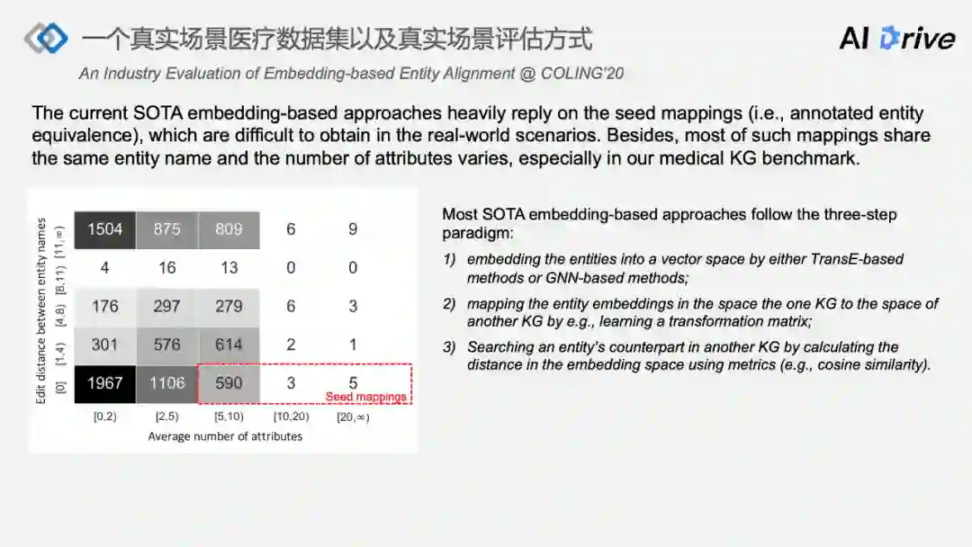 第一,发现大多数基于 embedding-based 的方法知识图谱对齐框架在实际使用中存在严重依赖种子数据、种子数据严重有偏的问题,可以提出基于真实医疗场景的知识图谱对齐数据以及真实场景的评估方式。
