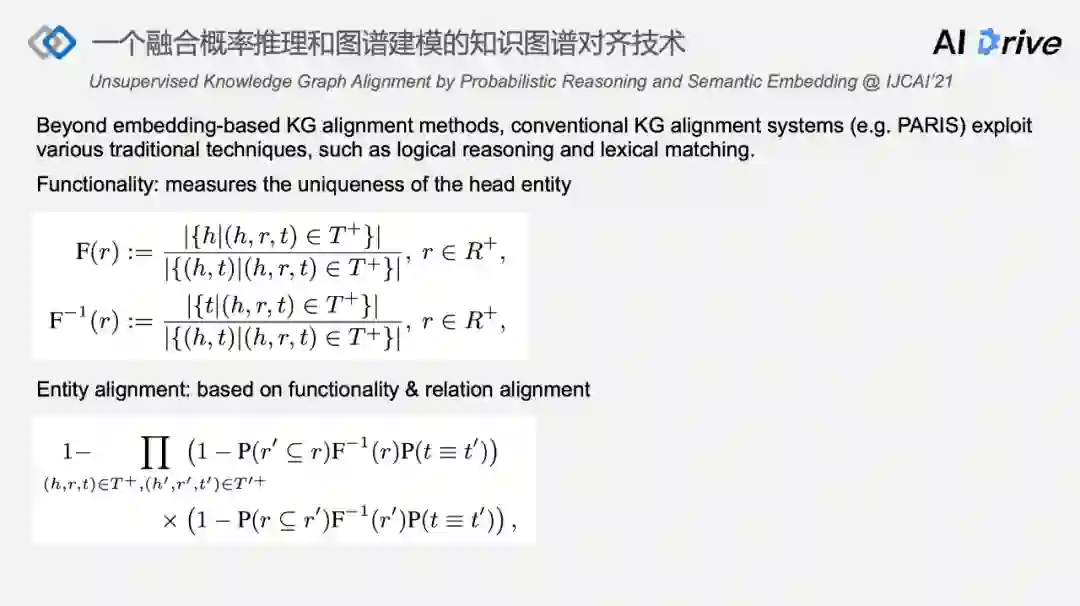 以 PARIS 系统为例,传统方法用到 logic consistency 技术或者相对 embedding 比较传统的技术 lexical matching,在语义网领域的效果证明了在很多数据集上不逊于 embedding-based 方法,比如 PARIS 的核心或者里面很重要的是基于对 functionality 的计算。functionality 最直观的理解是对于头实体的唯一指向性的描述,当 functionality 是 1 的时候,如果你的实体是确定的,有这个关系数据的尾实体也一定是确定的。如果 founder 的 functionality 是 1,对于任何一家公司的头实体来讲,只要有 founder 的关系,对应的尾实体是确定的(即创始人是唯一确定的)。它基于很多逻辑推理的工作。PARIS 在计算评估设计对齐概率时,会充分用到 functionality 的计算以及关系对齐计算。