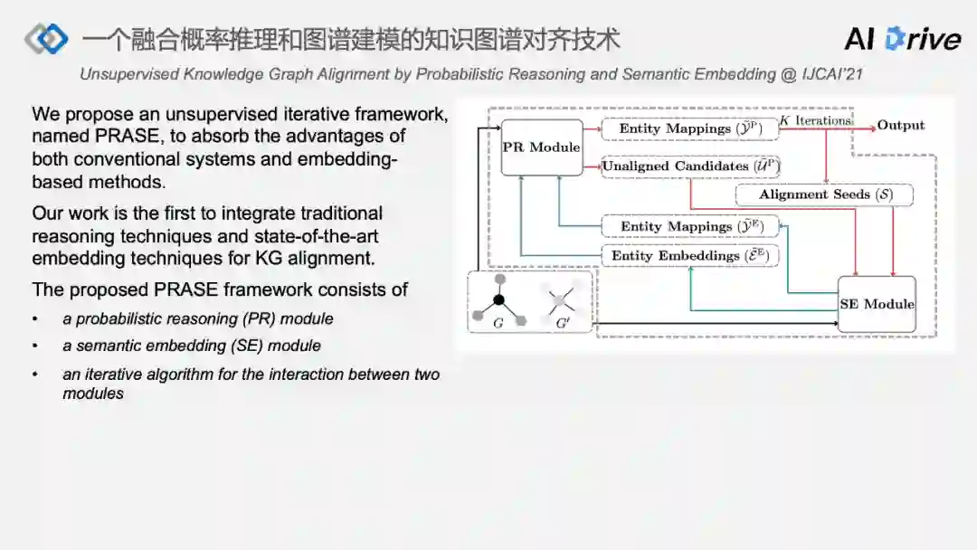 我们希望提出一种无监督的迭代框架,让两种完全不同方式模型可以在统一的框架中进行运作,首先,提出尝试将 traditional reasoning 方法以及 SOTA 的 embedding-based 方法相结合,在知识图谱对齐任务上,提出框架 PRASE(Probabilistic Reasoning And Semantic Embedding)。整个 PRASE 的引擎架构如上图所示,主要分为三个模块,一是 PR 模块,二是 SE 模块,三是迭代式的学习算法,让两个模块相互交互融合。
