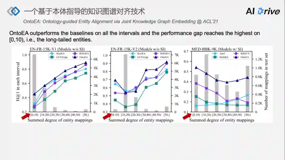 V2 版本的两个知识图谱,英语的 DBPl5K 和法语的 DBPl5K 的图谱更加稠密,每个实体的连接边更加多,但是它们所属的类别相对更少,比如 V2 版本只有 104 个类别,而 V1 的版本有 189 个类别,对应到 OntoEA 没有用到名称信息,但它的提升是比较直观的。