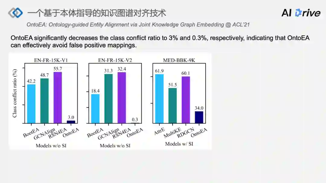 第二,我们再去检查类别冲突的 bad case 是否解决。有三个数据集,分别是 EN-FR 的 V1/V2 和工业数据集。可以看到,在最左边图示里,它表达的含义是 BootEA,所有的 bad case 当中有 42.2% 的 bad case 来自于类别冲突,但是对此 OntoEA 的 bad case 的百分比降到了 3%,在 V2 上降到 0.3%,在工业数据集上是由最低的 51.5% 降到了 34%,反过来可以印证当时加入本体信息所期待的效果,即可以减少 false positive 对齐结果,尤其是类别冲突所带来的 false positive。