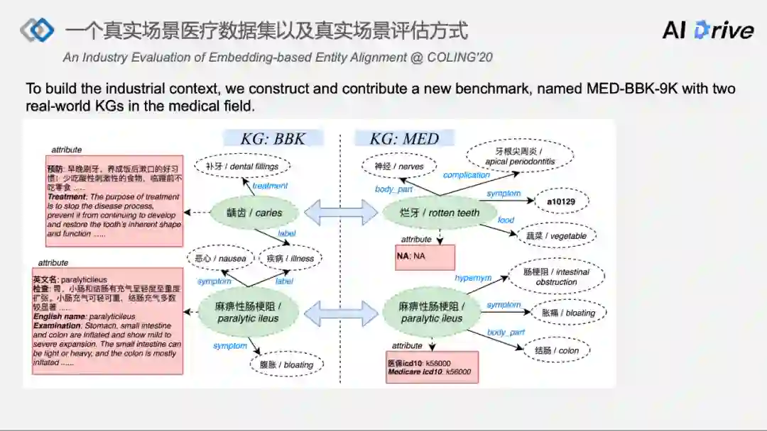 左边是从中爬虫软件和公开的 NER 等工具,在百度百科上构建出对应的医疗图谱,进行人工标注,比如“龋齿”和“烂牙”或者“麻痹性肠梗阻”的对齐。先前举例的实体名称和属性的数量在这里面很明显体现出来。比如,“龋齿”和“烂牙”的名称完全不一致,但麻痹性肠梗阻的名称是完全一致的。