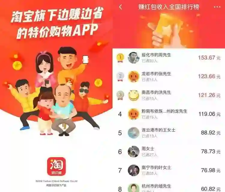 淘宝特价版不仅界面和操作都跟手机淘宝差不多,也可以用淘宝账号登录。以至于拉新赚红包的全国收入排行榜上都没几个赚了超过一百块的人。