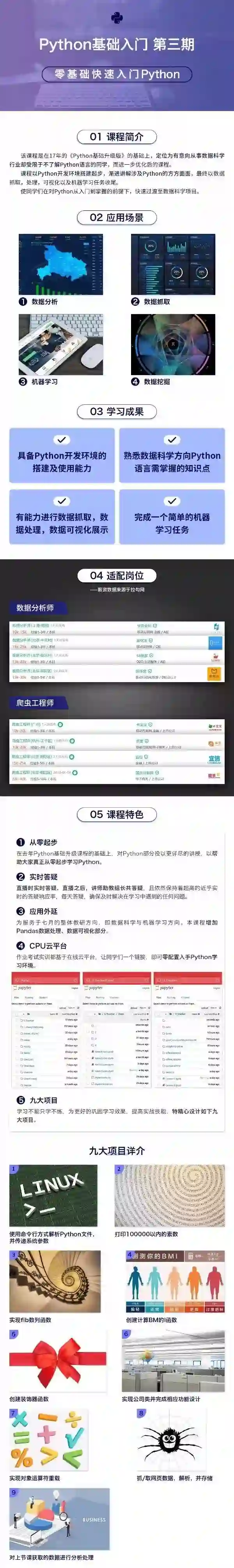 现在,有这样的一门课《Python基础入门 第三期》,一门真正的从零学Python课,带你快速入门Python。四大应用场景,五大课程特色,九大实战项目,更好的学习Python。