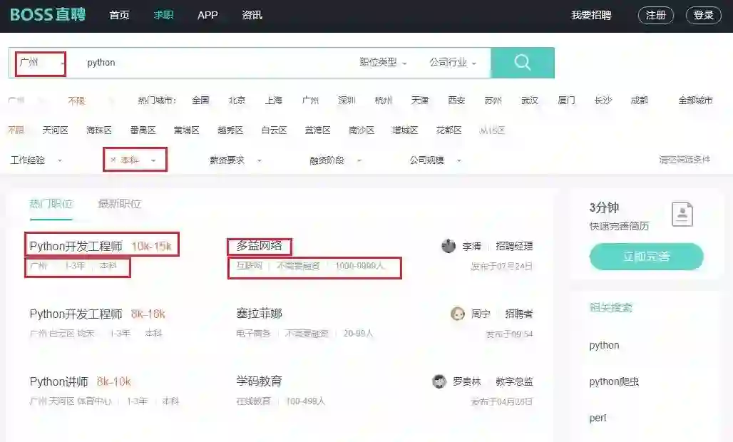 在招聘网站上直接以”本科生”和”Java”或”Python”作为筛选条件,以广州为例: