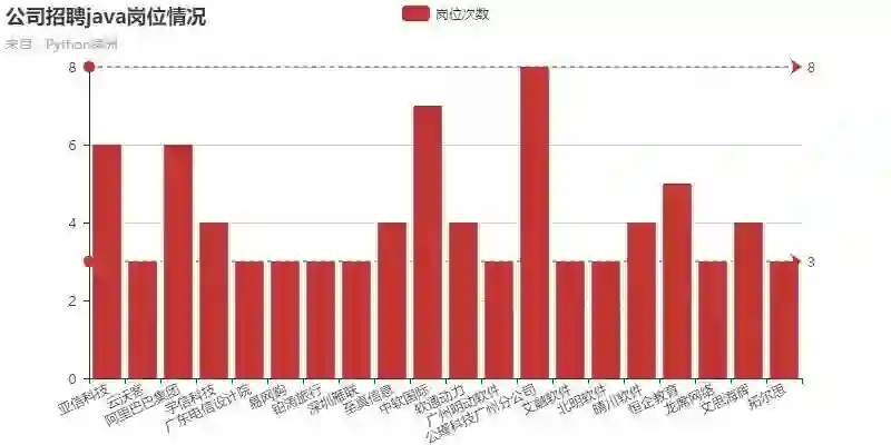 不难看出,越靠近城市中心的地区,招聘的岗位就越多,成功应聘的机会较高;番禺和天河区相差较大,其中天河区招的Python比Java将近多了8倍;番禺区Java比Python更加热门,受公司青睐;其他区相差不大。