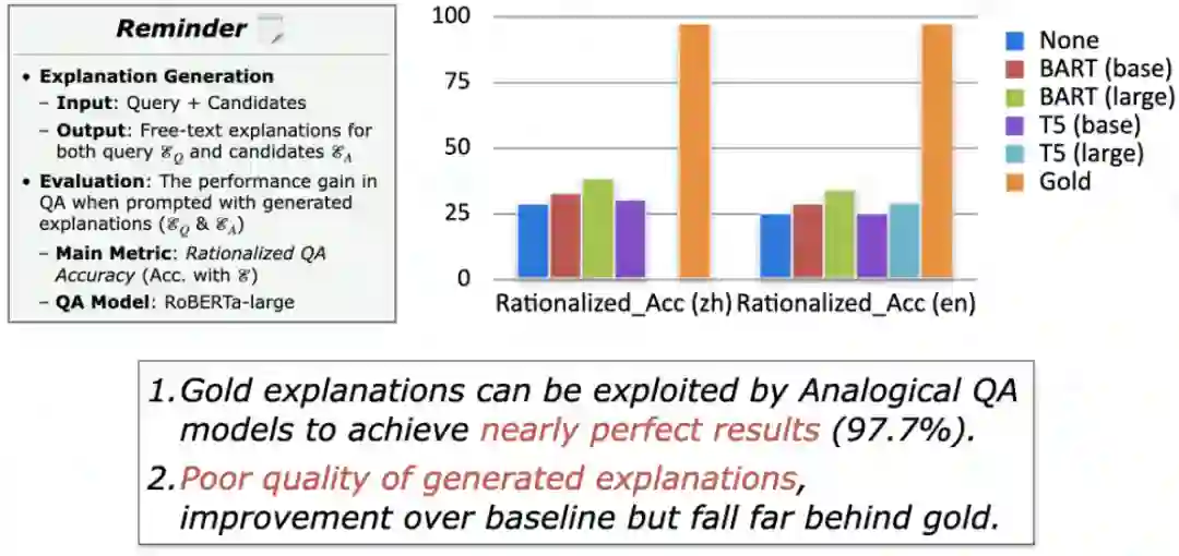 首先,用该研究事先标注好的解释去作为额外的输入,能帮助类比推理问答任务 (QA) 达到接近完美准确率。然而替换成生成的解释时,结果却差很多(图 8)。
