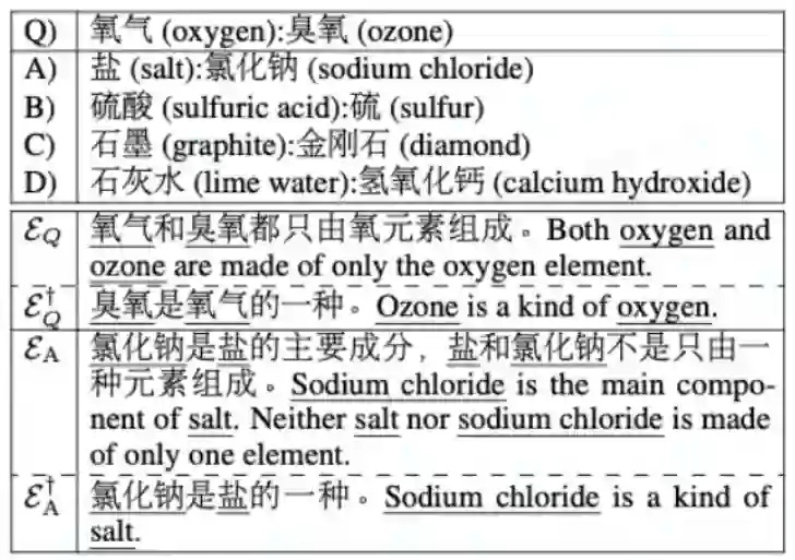 的是事先标注好的,可以看到,对于否定句,模型不知道盐和氯化钠都不是只由一种元素组成的,生成的解释偏向于 “A 是 B” 的模式。