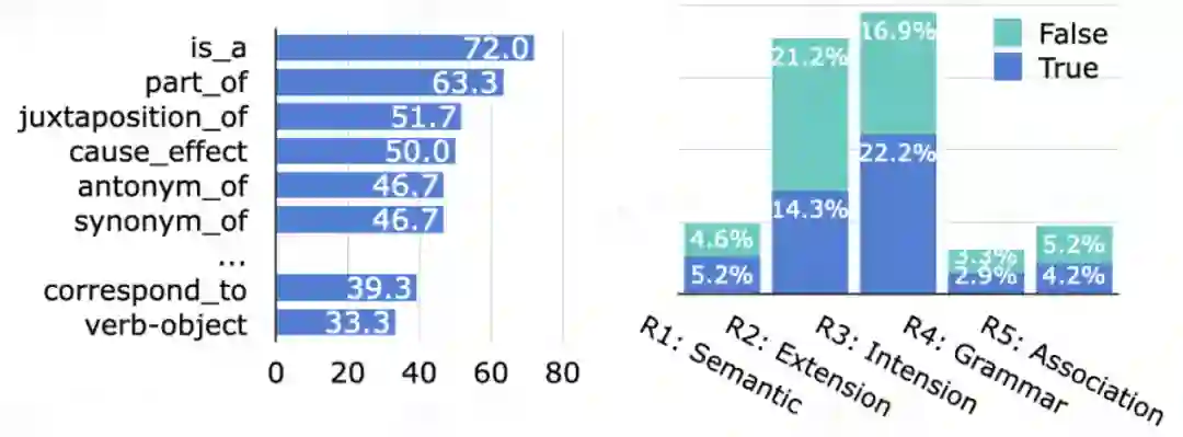 该研究对结果进行了错误分析(图 7),发现大多数错误发生在语义关系上,如 is_a、part_of、juxtaposition_of 等。这些类型的关系通常需要大量的常识和事实知识的参与。