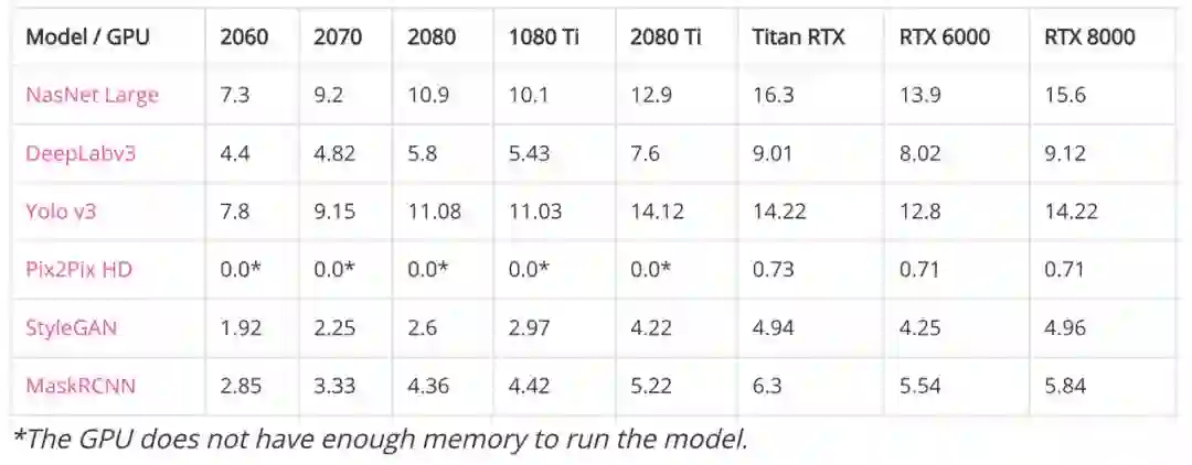为测试当前 GPU 性能,研究者们以 CV 和 NLP 两个方向的顶尖模型进行了测试。处理图像模型而言,基础版 GPU 或 Ti 系的处理的效果都不是很好,且相互差异不大。