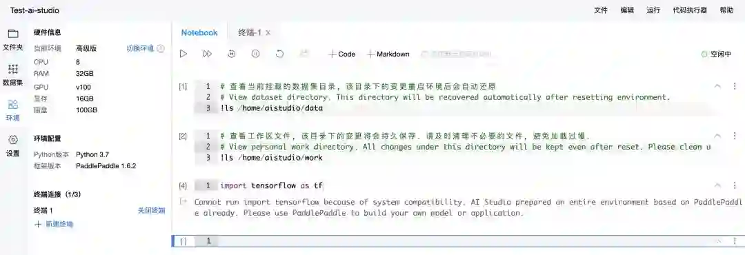 百度 AI Studio 也能提供非常强大的 V100 算力,且现在有免费算力卡计划,每天运行环境都能获得 12 小时的 GPU 使用时长。但问题在于,百度 AI Studio 只能调用 PaddlePaddle 框架,而不能自由选择 TF 或 PyTorch。