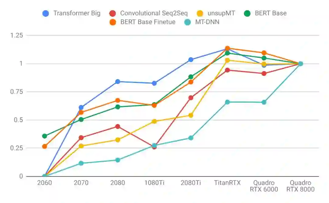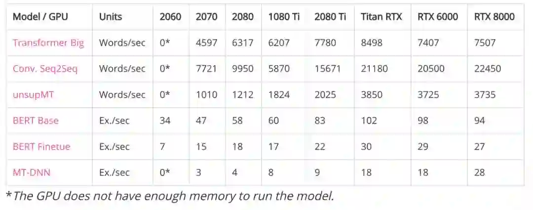 从图像识别、分割、检测与生成,到机器翻译、语言模型与 GLUE 基准,这些任务差不多覆盖了 GPU 使用的绝大多数场景,这样的测试也是比较合理了。