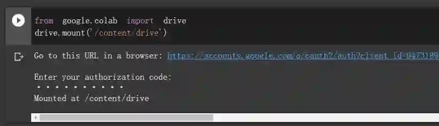 如上两行代码可以将谷歌云硬盘加载到远程实例的「content/drive」目录下,后面各种模型操作与数据集操作都可以在这个目录下完成,即使 Colab 断了连接,所有操作的内容也会保存在谷歌云盘。