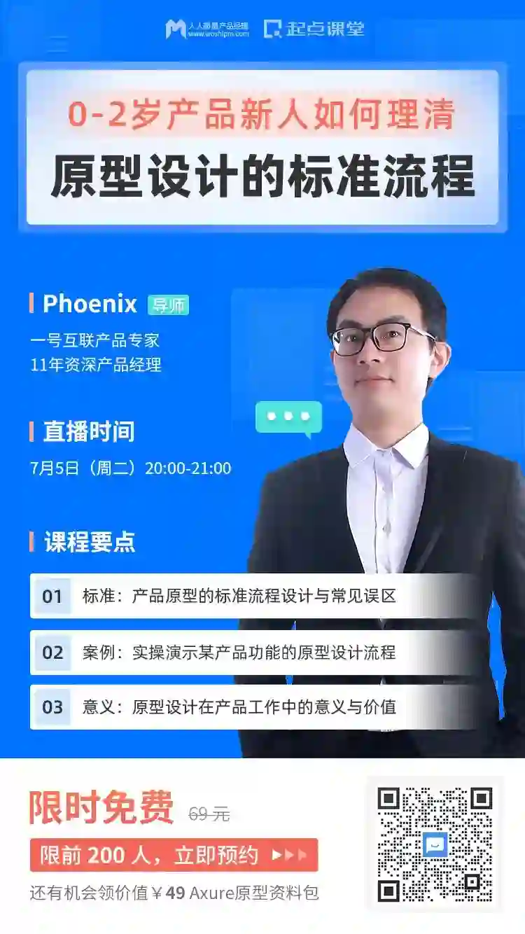 为了帮助这些产品新人更科学、更高效地设计原型,7月5日(周二)晚8点,人人都是产品经理旗下的起点课堂,特邀一号互联产品专家,11 年资深产品经理@Phoenix 老师,准备了这次直播公开课。