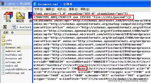 当往该docx的xml文件注入恶意代码(引用外部实体)时,可进行XXE攻击。