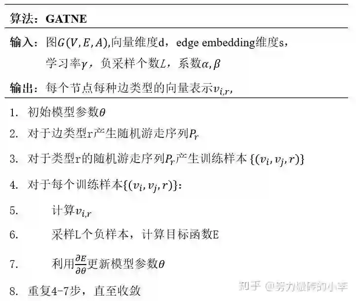 GATNE-T的核心思想就是聚合不同边类型的邻居到当前节点,然后对每一种边类型的节点都生成不同的向量表示,模型可分为如下四步: