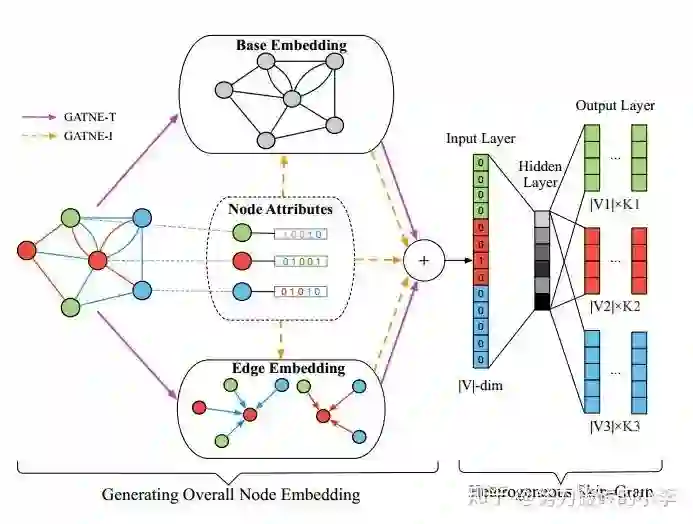 模型结构如下图所示,网络结构利用两部分向量Base Embedding和Edge embedding表示,其中Base Embedding为共享向量,出现在每一种边类型中;Edge embedding在每一种边类型中不同;GATNE-T仅仅利用了网络结构信息,GATNE-I同时考虑了网络结构信息和节点性质。