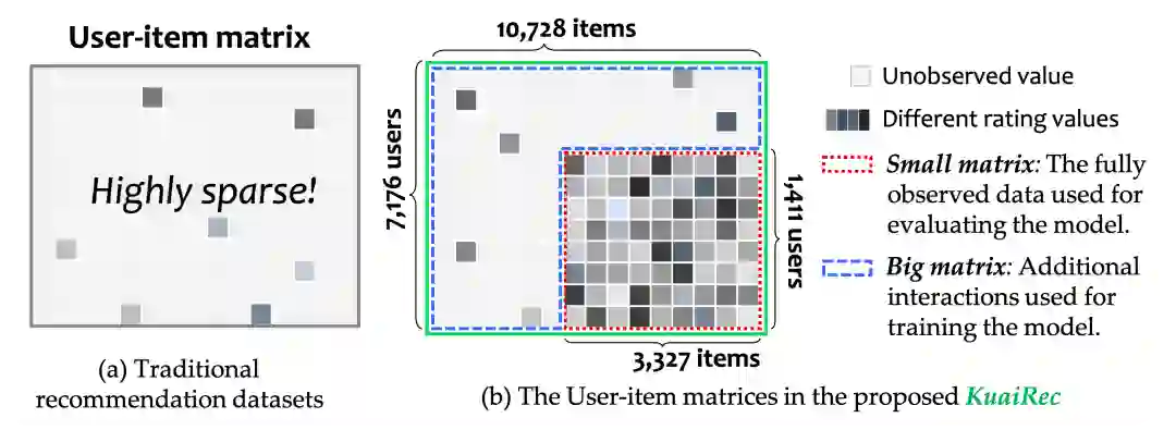 首先,要想得知任一用户对任意推荐商品的喜好,传统的推荐数据做不到,过于稀疏了。而我们在快手App上收集了一个全曝光的数据,解决了这个问题。见下图红色的小矩阵部分,1411个用户对3327个视频的偏好全部已知。
