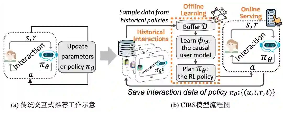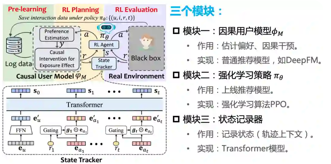 下图右边给出了我们提出的CIRS模型的流程。主要分为两步,学习一个因果用户模型(causal user model),再学一个强化学习的策略 。这就是一个强化学习模型的流程。