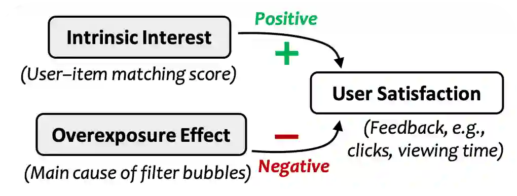 根据上一小节的讨论,我们能够建模,用户满意度与内在兴趣正相关,与过曝光效应负相关。如下图所示。