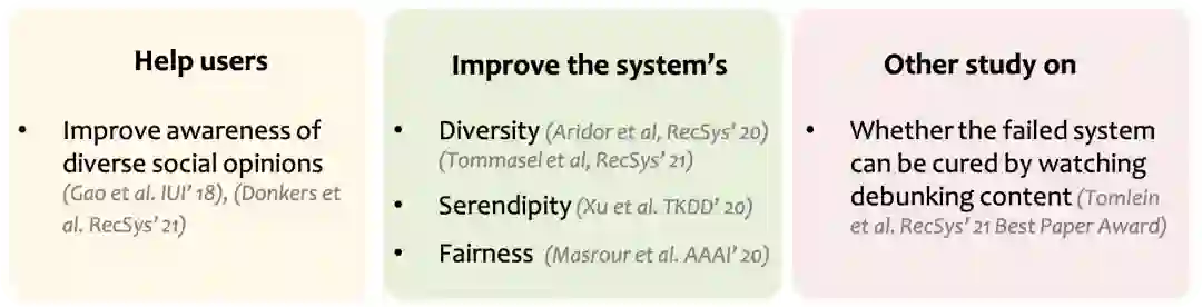 最直观的方式有提升推荐结果的多样性(diversity)、新颖性(serendipity)等,通过各种规则(rule)来干预推荐结果,使其不陷入单调的境地。下图总结了一些在推荐系统中常见的策略,详情可以参考我们论文引用部分。