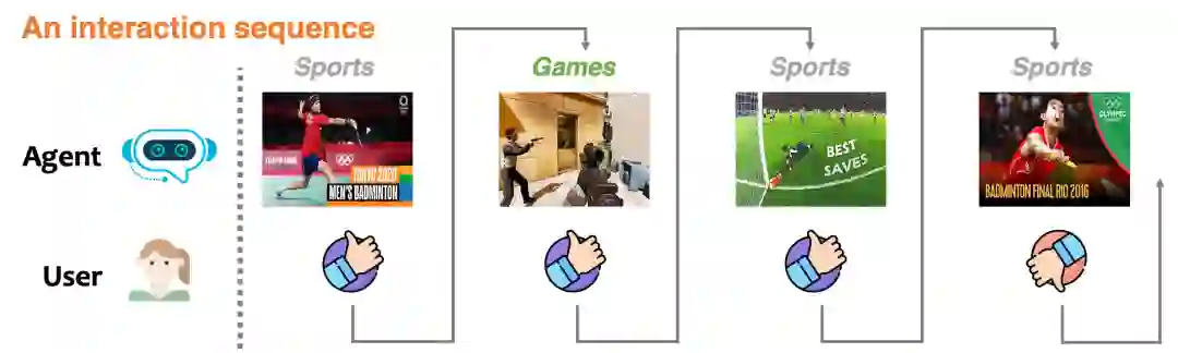 这个机制如何模拟呢?具体来说,在上述收集的全曝光的小矩阵数据上,我们从真实的1411个用户中随机采样并与训练好的交互式推荐策略模型进行交互。在推荐策略返回推荐结果,即从3327个商品中任一推荐一个商品后,我们查询小矩阵数据的对应的用户喜好值并如实返回作为监督信号,这个过程将一直重复。此外,我们指定一个使得交互中止的规定:即如果当前推荐的商品与最近 轮推荐的商品中有超过阈值 个商品有着相同的类目,例如都是美食类,则交互退出。