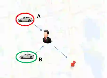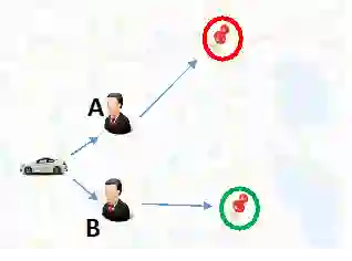 第二个例子是需求受限的情况。假设这里有一个乘客,司机A跟B分别在”冷区”和”热区”,而其他影响派单的因素完全一样,那么在这个情况下,可以认为把订单派给A会是更好的选择,因为B在”热区”期望上能比A更快地接到下一单,这样长期来看总体上最小化了A跟B的空车时间。