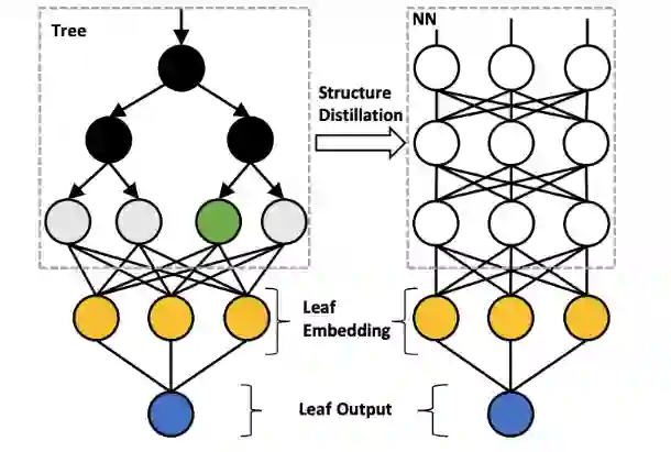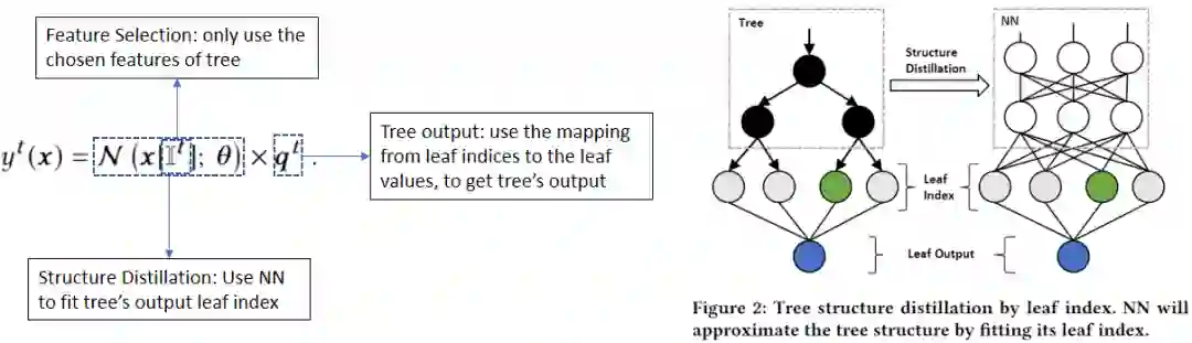 GBDT2NN 主要包含了3个部分:特征选择、结构蒸馏和决策树输出,其数学形式表达和大致框架如下所示: