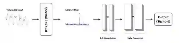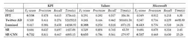 算法示意如图15所示。一个时间序列输入首先经过 Spectral Residual(SR) 模块。SR 是一种基于傅里叶变换的非监督模型,在视觉显著性领域取得了非常好的效果。经过 SR 变换的时间序列被称为 Saliency Map,在此基础之上,我们应用了一个额外的 CNN 网络输出预测结果。我们首次在时间序列异常检测问题中迁移使用了 SR 模型,该方法显著地提升了 SOTA 的精度。同时,我们首次将 SR 与 CNN 相结合,进一步改进了 SR 的性能(评测如表5所示)。在我们的应用中,CNN 可以由完全虚构的数据训练,从而解决了数据标注的问题。