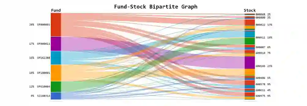 所以我们认为,被相同基金经理投资的股票之间会具有相似的性质,从而可以从基金经理们的行为模式中学习得到股票的性质的表达方式。因此,我们将过去时间内基金经理们对股票的投资构建出一个二分图(如图6),其中点表示为基金和股票,边表示投资的份额。然后我们通过图嵌入的算法得到股票的向量表达方式。最后通过一个神经网络模型,以股票的向量表征方式和原始的因子作为输入,学习出优化后的因子数值。实验证明,相比于原始特征因子而言,优化后的因子对于金融投资具有更好的借鉴意义。