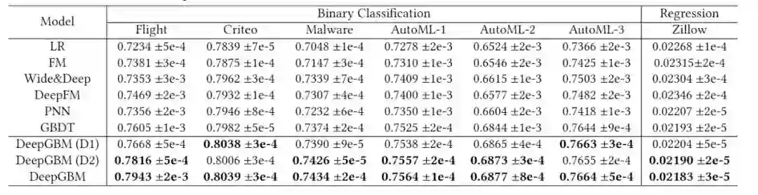该论文使用了7个数据集来验证 DeepGBM 模型的效果。离线实验和在线实验的结果分别如表2和图4所示。离线实验表明:1)基于 GBDT 的模型较 NN 模型有更好的表现;2)GBDT2NN 在 GBDT 的基础上还有一定提升;3)DeepGBM 的表现比所有的基线模型都要好。在线实验表明:DeepGBM 契合在线场景,且效果比所有的基线模型都要好。