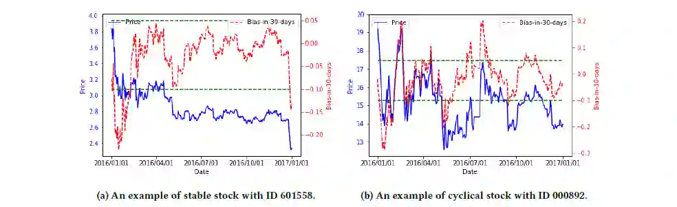 在金融市场的风险决策中,金融特征因子是通过对过去一段时间内市场价格的进行数学运算而形成的,它们往往能反映对应股票的一系列特征,从而对构建金融投资策略起到重要的作用。然而我们发现不同股票对于同一个金融特征因子的亲和度往往是不同的,也就是说即使两个股票拥有相同的金融特征因子的数值,这并不意味着它们此刻的状态是相同的。如图5所示,对于两只不同的股票(ID 601558和ID 000892),即使在特征因子bias-in-30-days上拥有同样的值(例如-0.1),但对两只股票来讲,含义是非常不同的。