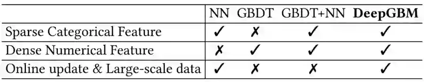 而目前广泛用于这些任务的机器学习模型都没有完美适配这两个重要的特性。常用的机器学习模型大致可分为三类:梯度提升树(GBDT)、神经网络(NN)和二者(GBDT+NN)结合的模型。其中 GBDT 可以很好地处理连续的数值特征,但很难处理好稀疏的类别特征,并且 GBDT 是利用全量数据学习的,很难高效地进行在线更新;而 NN(如Wide&Deep、DeepFM等)虽然可以用 embedding 技术处理好稀疏类别特征,且可以高效地在线更新,但其难以很好地处理数值特征;常见的 GBDT+NN 方法会单独使用 GBDT 再使用 NN,但同样由于 GBDT 的缘故,难以在线更新。综上,其特点对比如表1所示: