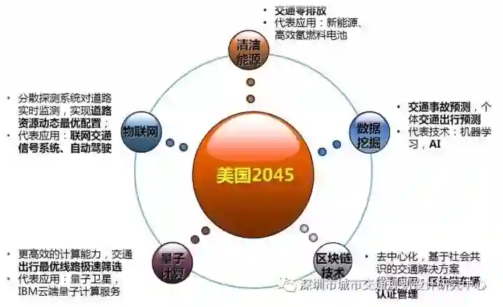 美国《2016-2045年新兴科技趋势报告》对未来30年交通相关的新兴科技也进行了预测,物联网、清洁能源、数据挖掘、区块链、量子计算等技术将对传统交通模式进行洗牌,我们正处于第四次科技革命的风口浪尖。