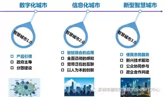 工业文明以来,城市逐渐从数字化城市走向信息化城市再到高度智慧化的新型智慧城市,我们即将进入智慧城市3.0的新时代,即以服务为核心导向的新型智慧城市。