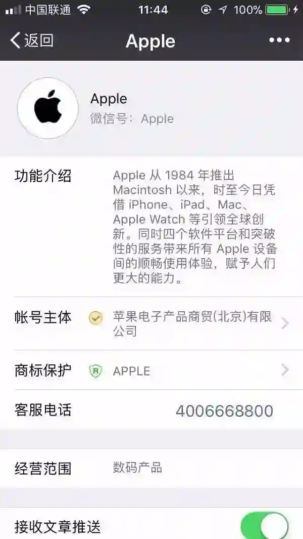 这个公众号的名字是Apple,ID也是Apple;由于微信官方规定公众号ID不少于六个字符,可见是微信官方为苹果开辟了一个VIP通道。当然,与苹果历来准求极致简约的风格一致,这个公众号的头像就是白底的黑色苹果logo。