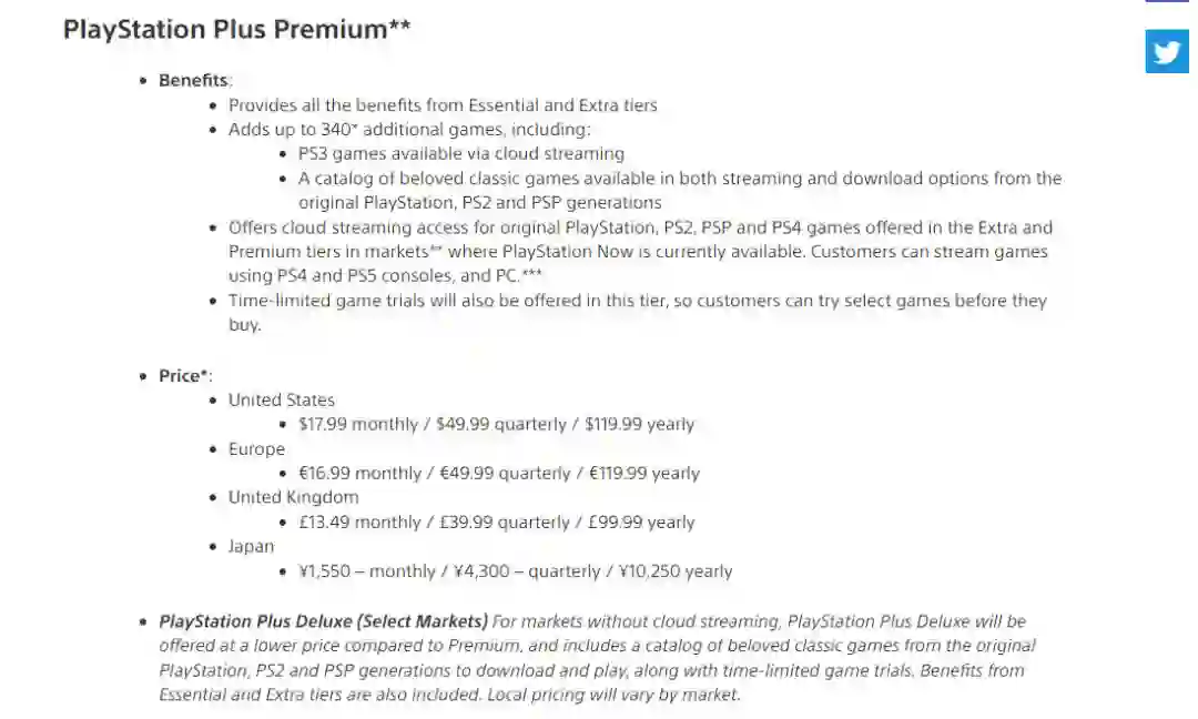 PlayStation Plus Premium,提供 Essential 和 Extra 两档的所有福利,外加 340 款游戏,包括可以云端串流的 PS3 游戏以及 PS1,PS2 和 PSP 世代的游戏库,支持串流和下载游玩。