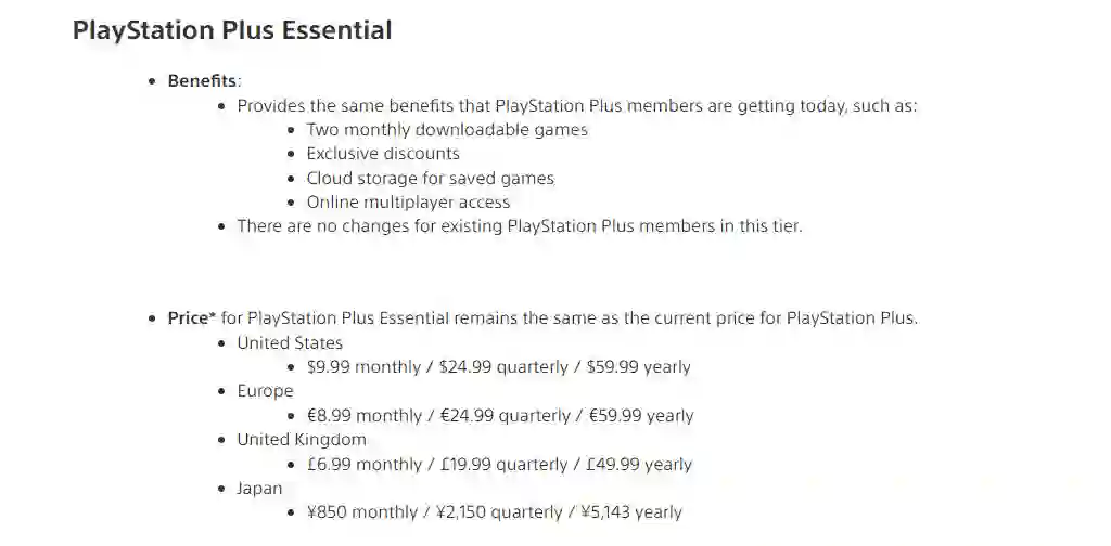 PlayStation Plus Essential,提供和当前 PS Plus 用户一样的福利,包括每月两款可下载游戏,独家折扣,云存储,在线多人游玩权限,日服价格为月费 850 日元,季费 2150 日元,年费 5143 日元。