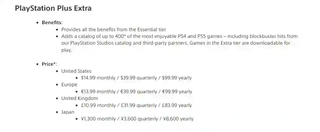 PlayStation Plus Extra,提供 Essential 这一档的所有福利,加入最多 400 款最令人享受的 PS4 和 PS5 游戏库,包括索尼第一方工作室和第三方的重磅大作。只能通过下载游玩,日服价格为月费 1300 日元,季费 3600 日元,年费 8600 日元。