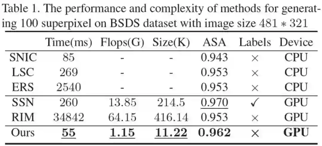 极大地降低了超像素分割的空间复杂度与时间复杂度(相比SSN参数量降低近20倍同时运算时间加快了近 4倍)