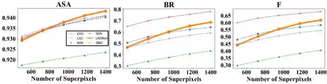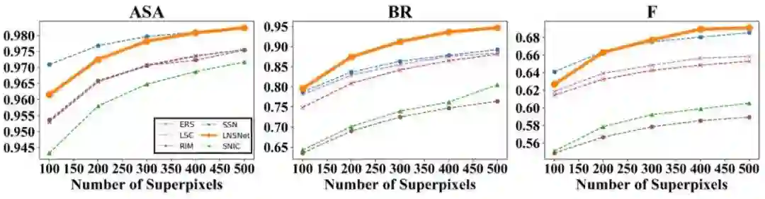 首先,我们在 BSDS 数据集上进行了实验,可以看到我们提出的超像素分割策略在 ASA、BR、F 等常用超像素评价指标中都远高于其余无监督的超像素分割方法(包括传统方法 SLIC、LSC、ERS,RIM)。此外,相比于依赖分割标签的有监督超像素分割方法 SSN,由于我们的方法在训练过程中无法感知到高层语义信息,导致分割结果会产生相对较多的冗余超像素块,这点造成了我们的方法的分割精确性较低,因此在 ASA 及 F 指标中略低于 SSN。然而这一特点也使得我们的模型具有更好的分割召回率,对于一些复杂场景中的模糊边缘的拟合性更好,因此我们的方法可以取得更高的 BR 指标