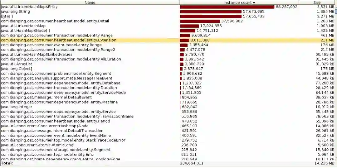 结合测试环境中 CAT 进程的堆 dump,"jmap -histo $pid" 的输出的分析中,我们发现还存在如下几个问题: