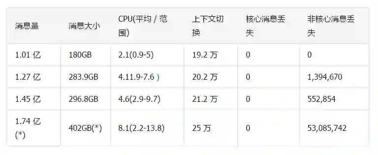 注:1.74 亿消息量是人为加大负载,每秒网络流量 114MB(402GB/3600) ,已打满千兆线路。