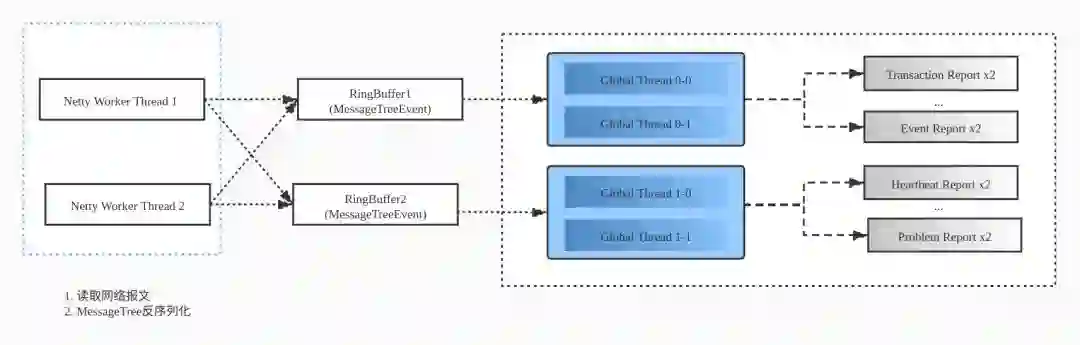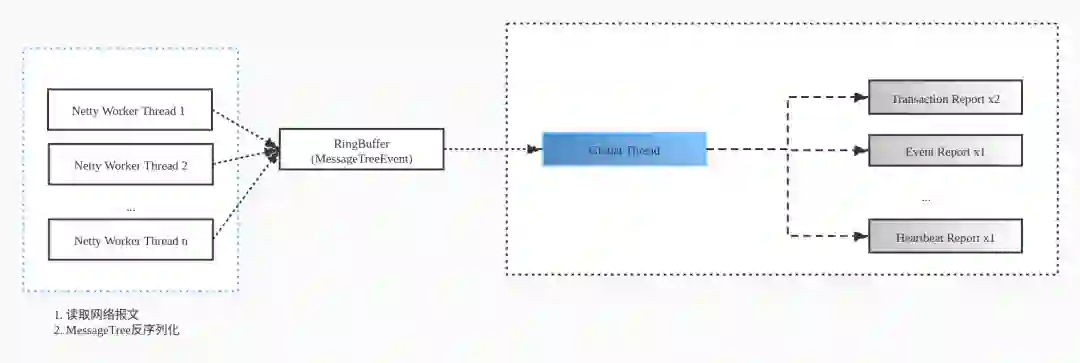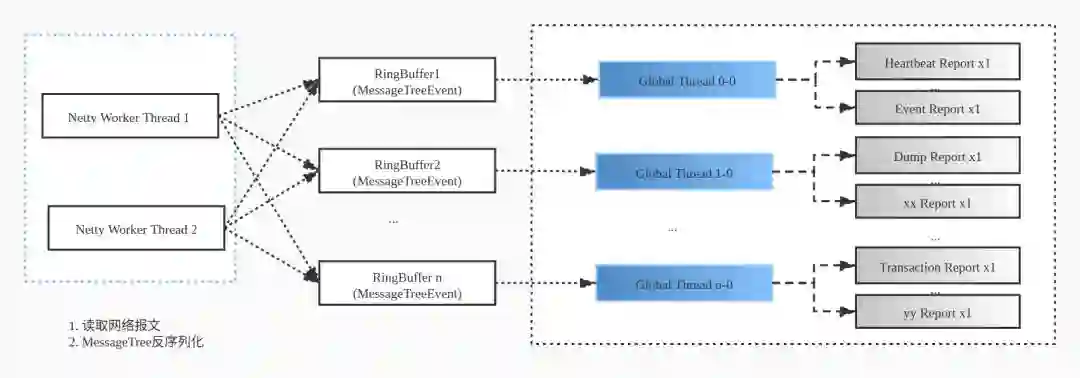 我们挑选了大概 10 个 Analyzer 加入这个大的 RingBuffer 来处理,但无论如何如何增大 buffer 消息丢弃情况还是有点多,特别是较为重要的 Transaction/Problem 等 Analyzer 的消息。