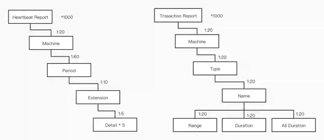 从 CAT 的 heap dump 中我们看到最大的对象主要是当前小时的各种 Report 对象, 这些 Report 大量使用了多层级的 Map 结构,如下图 (图中的数字是经验估计数量)。可以看到 Map 对象非常多, 特别是层次往下的那些对象。