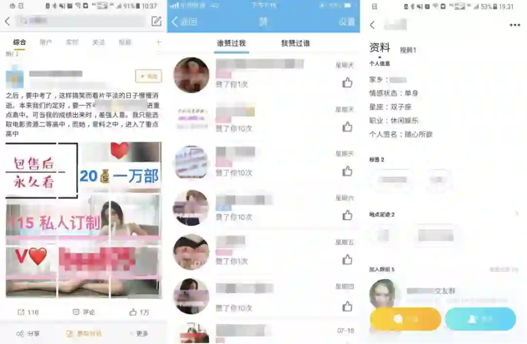 整篇微博将所有的关注点都引导到了“加V看片”上,这个套路怎么感觉有点熟悉?无论是各种社交软件还是手游端游、直播,都能看到这种卖片的牛皮癣广告。