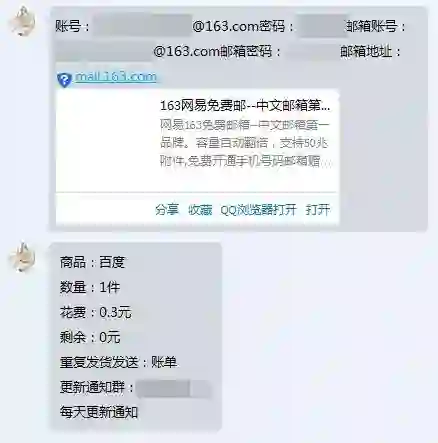 群内是禁止交流的,在“小头目”指点下,我明白了整个货源的提取方式。在群内首先和QQ机器人进行私聊,随后根据提示进行操作,交易成功后机器人会生成一个云盘账号发给我。